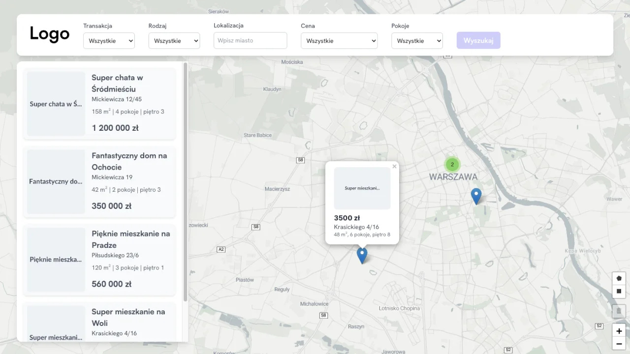 The heart of the project is the interactive map with markers. It dynamically presents all available offers. Each property is marked with a pin; clicking it reveals a pop-up with basic information.